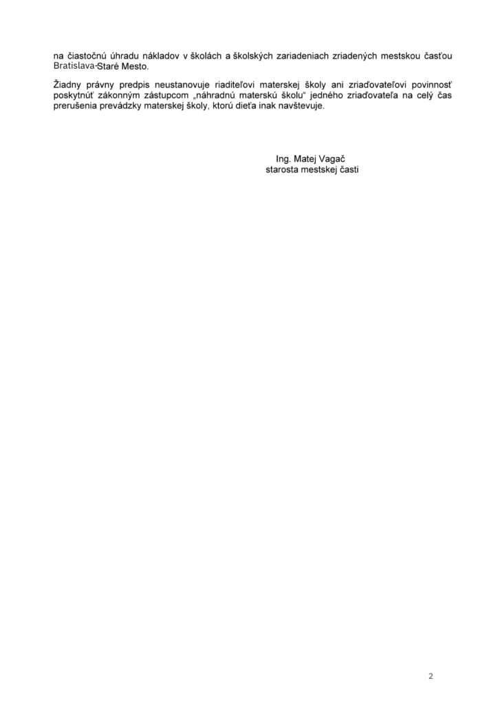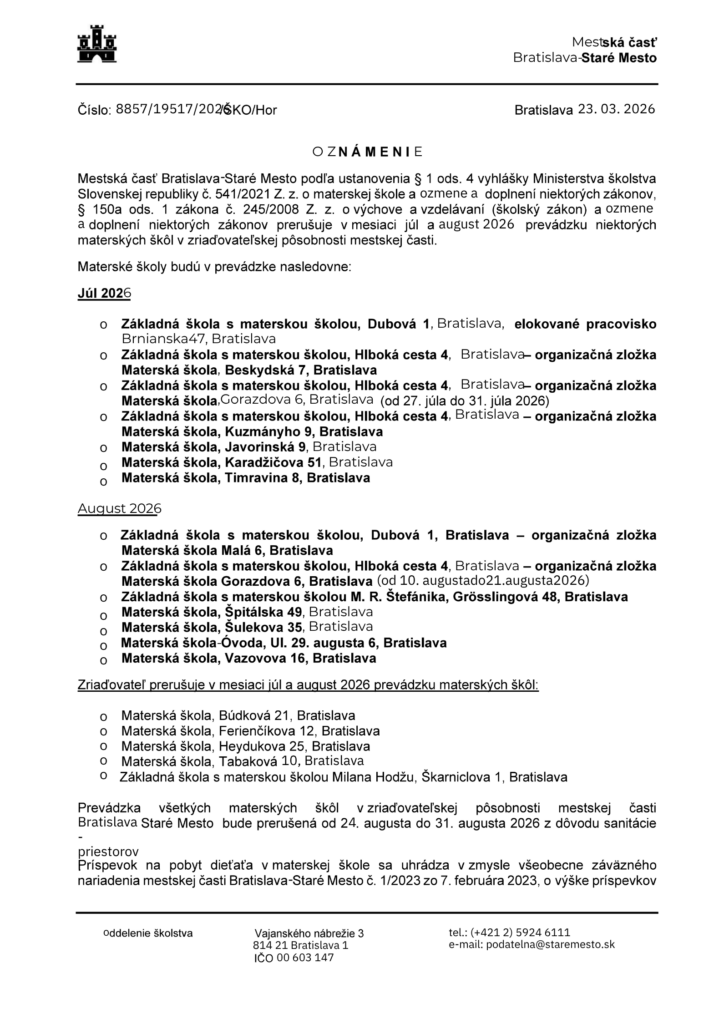 Mestská časť Bratislava-Staré Mesto podľa ustanovenia § 1 ods. 4 vyhlášky Ministerstva školstva Slovenskej republiky č. 541/2021 Z. z. o materskej škole a o zmene a doplnení niektorých zákonov, § 150a ods. 1 zákona č. 245/2008 Z. z. o výchove a vzdelávaní (školský zákon) a o zmene a doplnení niektorých zákonov prerušuje v mesiaci júl a august 2026 prevádzku niektorých materských škôl v zriaďovateľskej pôsobnosti mestskej časti